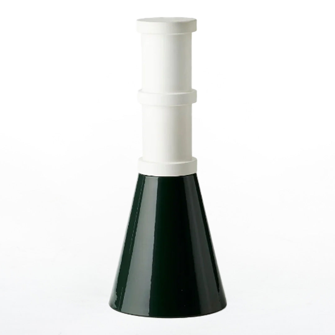 Forma compuesta por dos elementos torneados a mano en arcilla blanca. Esmalte verde bosque brillante y blanco mate.