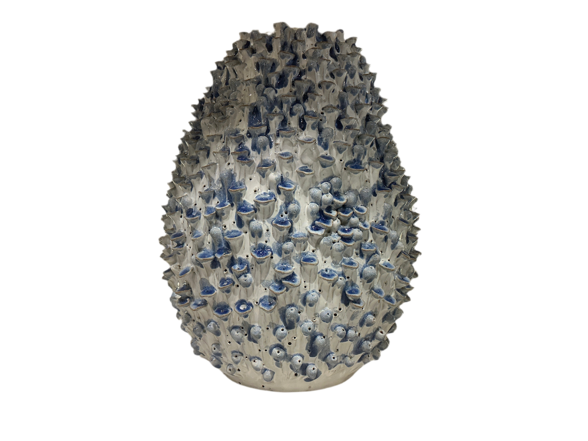 Carefully sculpted by some of the most talented craftsmen, then finished with a glossy ocean blue and white glaze. Perfect as an accent piece in any room, or compliment its beauty by adding your favorite flower. This stunning piece radiates elegance and beauty, and will make a statement anywhere its placed