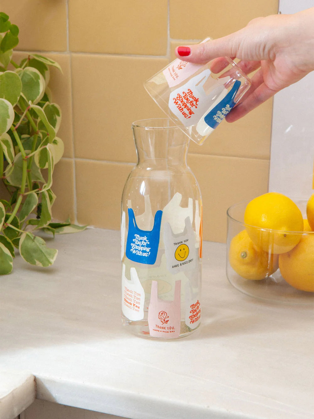 Juego de jarra y vaso con ilustraciones de iconos , que infundirán en tu espacio un regalo retro .